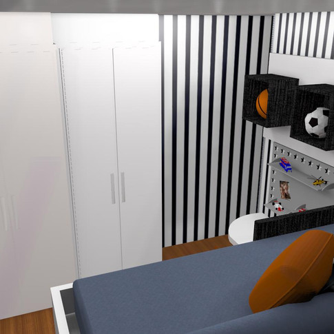 Esse quarto foi executado para o Nicolas de apenas 4 anos, em um apartamento no Água Verde. A necessidade da cliente em achar espaço para a rouparia na sua casa, isso obrigou a esse quarto cumprir também a essa função. O aproveitamento é total nos moveis, tanto embaixo da cama com um ármario aproveitando a profundidade total dela, como até aonde foi colocado a escada. Essa escada esta dividida em duas partes para que a parte de baixo seja removida e esse espaço que seria perdido aproveitado para coloca objetos ou até brinquedos.